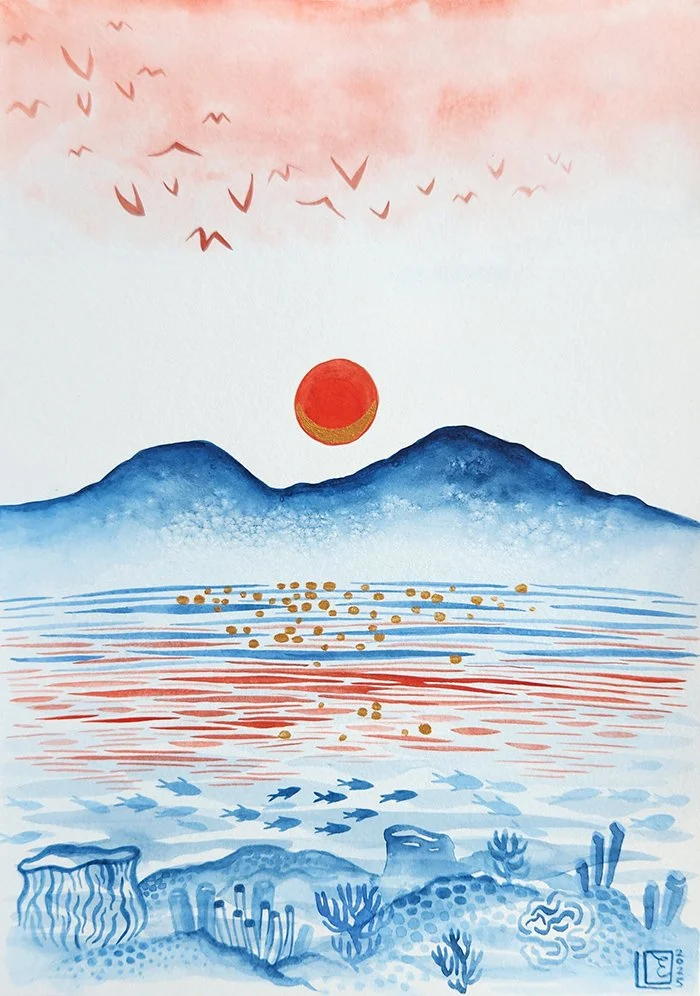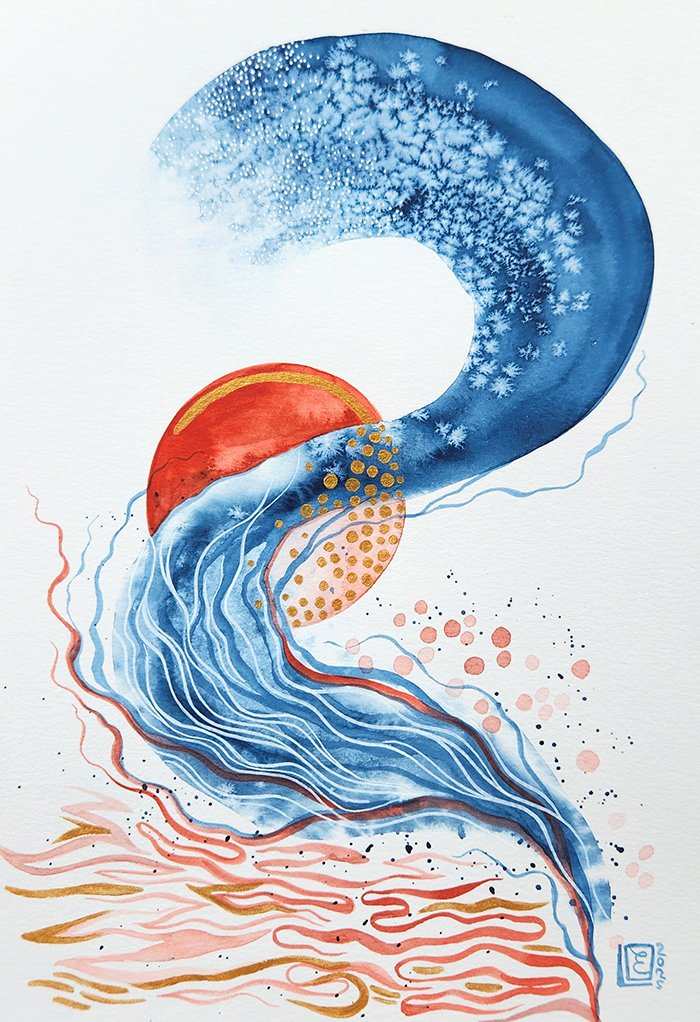 Aquarelle, peinture acrylique dorée. Papier aquarelle 300g, 20x30cm.