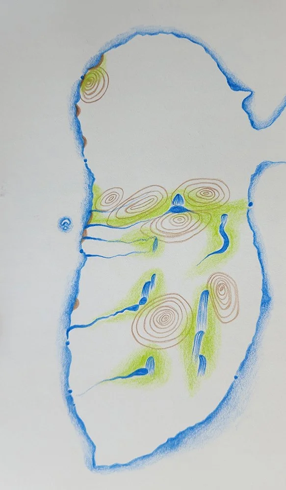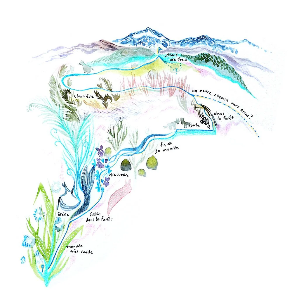 À travers le dessin, la peinture et le collage, je détourne les codes de la cartographie pour explorer d’autres façons de lire et de comprendre l’espace. Chaque carte propose un regard sensible et subjectif sur le territoire, entre observation et imagination.