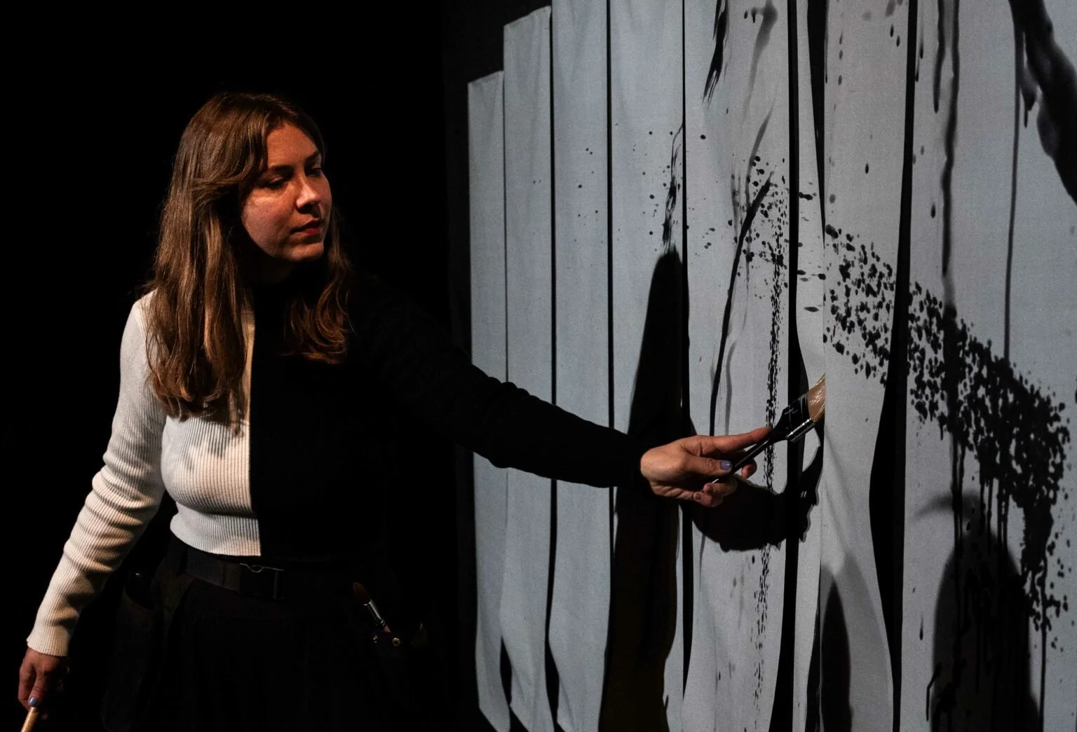 Au cœur de ces projets, je réalise des peintures en direct. J’alterne entre improvisation et maîtrise, en utilisant différents dispositifs selon projet et contexte : toiles en fond de scène, dessins filmés et projetés en temps réel, peinture sur installation en papier, rétroprojecteur…